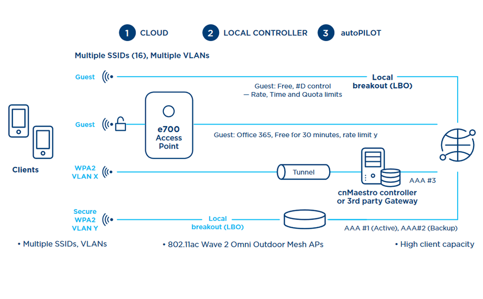Controller Modes: Autonomous Controller-less operations (E.g.: roaming), Cloud Managed, On-premise virtualized controller