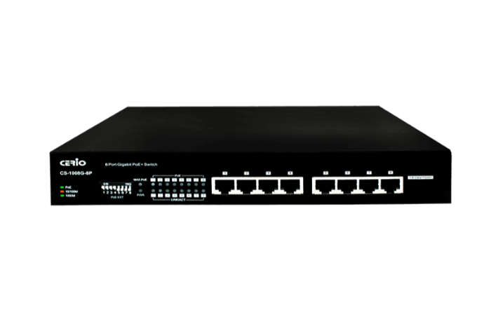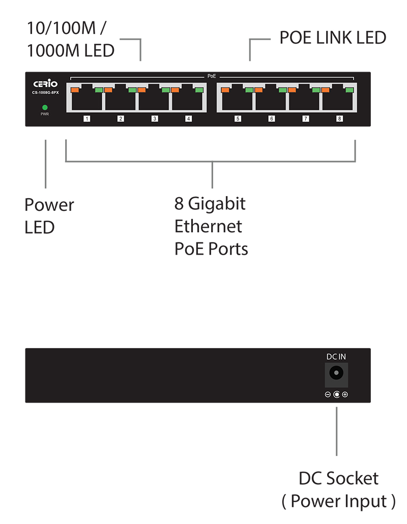 | LED Indicators | Per Gigabit Port:(Link/Act): Status x 8 PoE : Status x 8 Per Unit: Power x 1 |