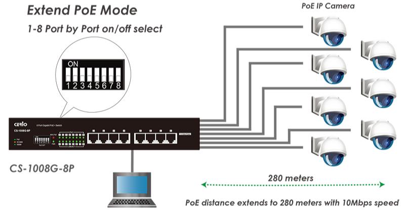 Supporting the power up to 30Watt/15.4Watt/7.5Watt/4Watt for each PSE/PoE+ port with bundle Power Adapter have 90Watt share for 8 PoE ports.