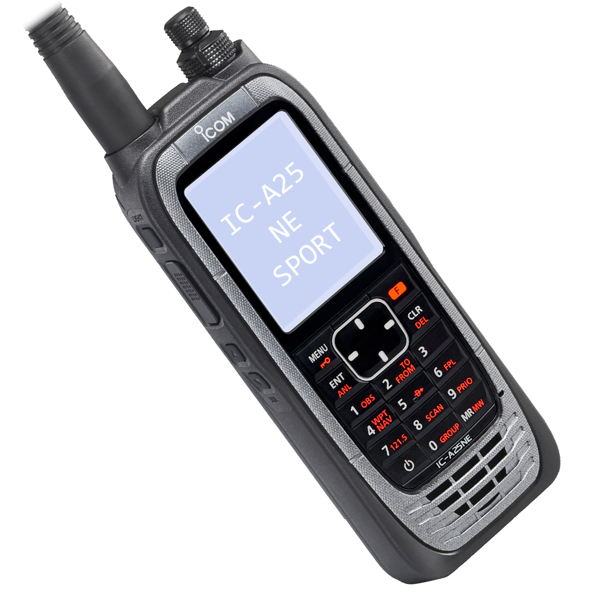 The IC-A25NE is the latest development in airband radio technology featuring built-in Bluetooth, GPS and significant VOR navigation functions. Featuring 6 watts of output power, this stylish modern design, easy-to-use interface and large 2.3-inch LCD combine to provide stress-free programming and easy in-flight operation. The handheld includes a large 2350mAh Li-ion battery, providing longer operating time.
