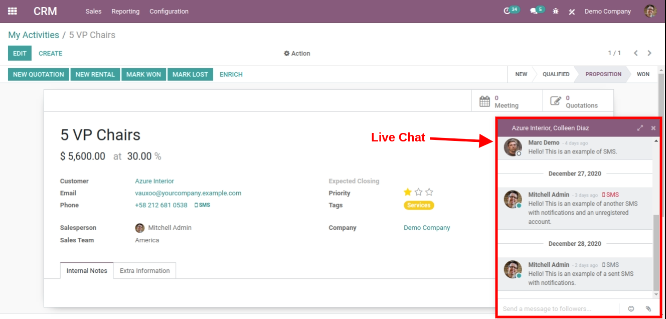 Another great feature is Opportunity management where you can organize different activities that are actually needed to covert into opportunity. In any industry, there are various stages that need to be followed by sales people for converting a prospect into the lead and then lead into an opportunity. With Odoo you can define different stages of your opportunities, as in our case, the opportunity will be Discussion, Proposal, Negotiation, Closing, etc.