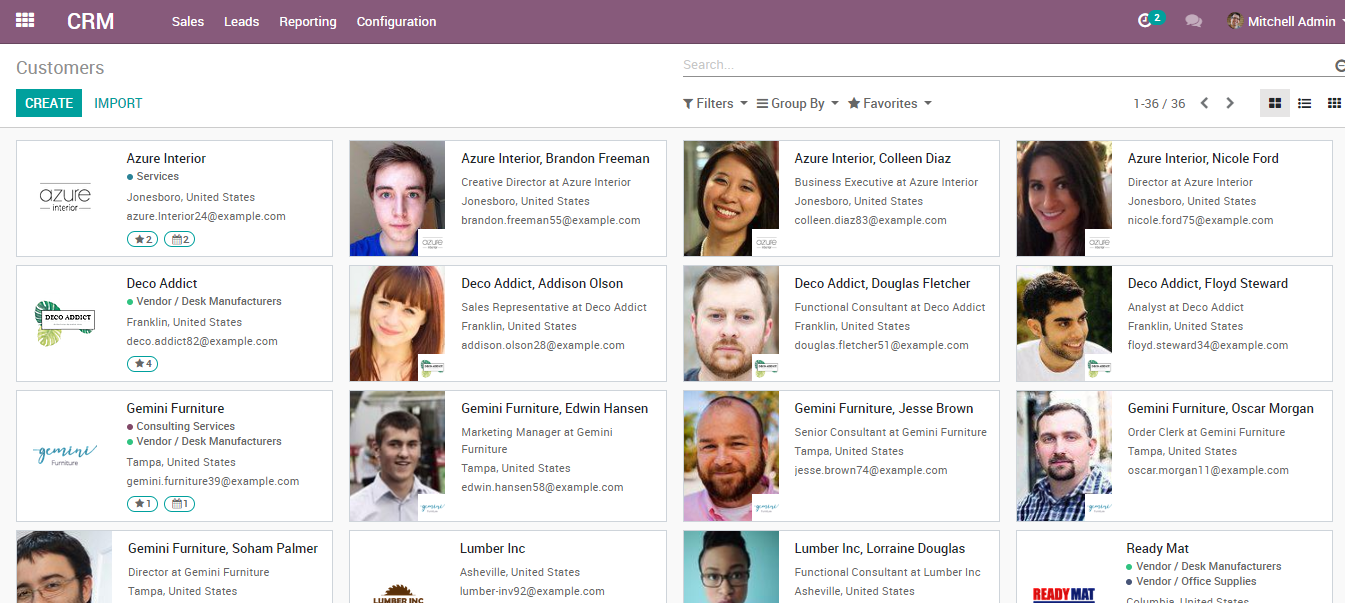 Most CRM's rely on integration with third-party apps to perform business as usual. When this is the case, marketing and sales rely on several separate applications with many logins to ensure that they can do their jobs. Odoo, contains all of the applications that your sales, marketing, accounts department and management teams need in the one place.