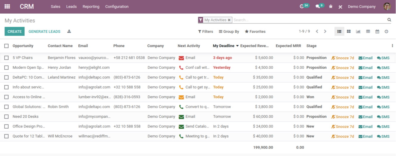 Odoo CRM helps you to plan next day action based on your daily work. With this function planning within every salesperson is easy to understand the list of tasks and important activities that need to be executed.