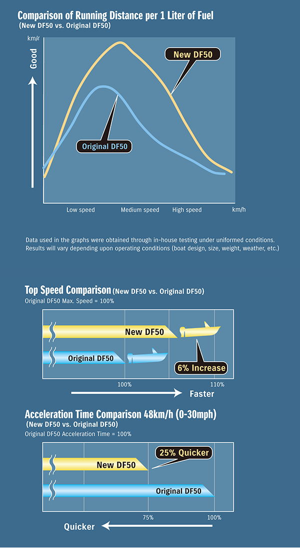Suzuki engineers based the DF50A and DF40A engine on Suzuki's proven in-line three-cylinder 12-valve engine. This high performance engine has a displacement of 941cm3 and features a DOHC powerhead—the only DOHC engine used in the 36.8kW (50PS)/29.4kW (40PS) outboard class—with four valves per cylinder, and an air intake system optimized for maximum efficiency in the high rpm range. When designing this engine, Suzuki engineers also focused on improving mechanical efficiency. Each component was analyzed and redesigned to reduce mechanical loss in order to improve efficiency. As an example, a new oil pump design makes internal oil flow more efficient, keeping moving parts better lubricated while using less energy. The combined reduction in mechanical loss throughout the engine contributes to better fuel economy