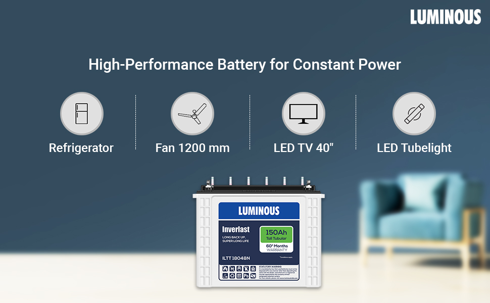 Luminous is one of the renowned manufacturers that produce both Tubular as well as Flat Plate inverter batteries. These batteries are designed with a balanced plate that improves the charge acceptance and performs well in deep discharge recovery. Hence, they can fulfill the demand of excessive power supply. Luminous inverter 150Ah batteries are light in weight, require less maintenance and provide power-packed performance. These batteries have unique alloy composition that protects the lead material of the cell from corrosion while providing a superior battery life.