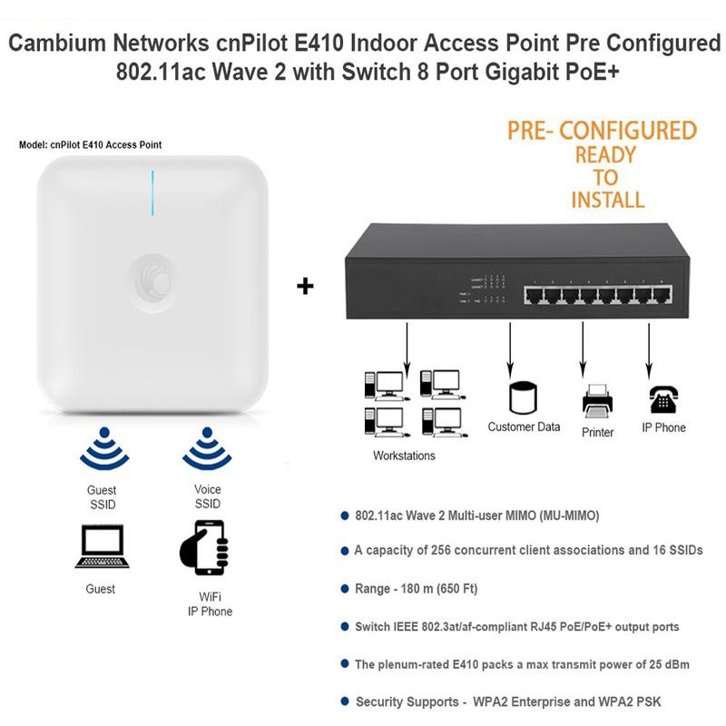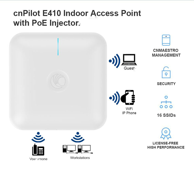 The compact low profile 802.11ac Wave 2 Multiuser MIMO (MU-MIMO) beamforming, high speed E410 Enterprise access point future proofs your Indoor access point deployments and is perfect for Schools, Indoor public spaces, Malls, Hotels and Resorts (Hospitality), Coffee shops, Multi-dwelling units (MDUs) or just about any place indoor that needs reliable high performing access points.
