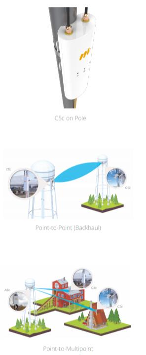 5c has been designed specifically to handle long-range backhaul (PTP), point-to-multipoint (PTMP) GigaPoP links, and PTMP MicroPoP links impaired by vegetation. Connectorized by design, the C5c mates with many popular antennas, delivering 700 Mbps of TCP throughput.