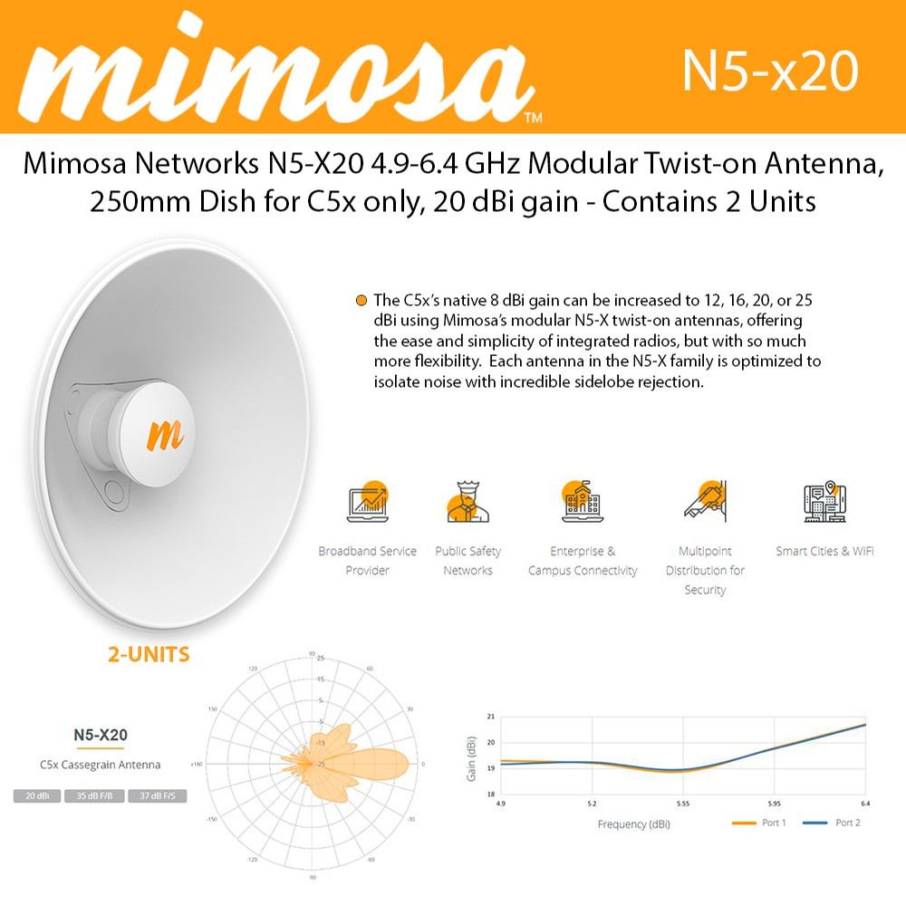 Mimosa N5-X20 Dish is the industry’s most versatile, modular, radio solution with five gain 20 dBi. The ultra-rugged solution provides extended frequency operation from 4.9–6.4 GHz, with best-in-class noise immunity. Delivering the ultimate in flexibility and value, the C5x is the go-to solution for 5 GHz deployments. Out of the box, the C5x can be used in PTMP mode, with Ethernet link speeds of up to 100 Mbps. With the purchase of a PTMP speed feature key, speeds of up to 500 Mbps will be unlocked in PTMP mode. In order to unlock and utilize PTP mode, with speeds of up to 700 Mbps, a PTP feature key must be purchased.