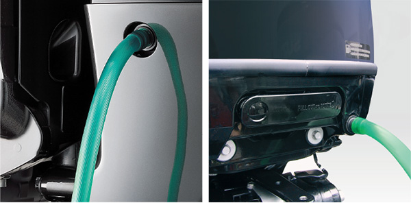 Over time, salt, sand, and dirt build up can restrict flow in the cooling system causing damage. To help prevent such buildup, DF100B/90A/80A/70A are equipped with two freshwater flush ports that make flushing the cooling system much easier. With one port located on the port side of the down housing and a second on the front panel, you’ll always have easy access to the flushing system whether the boat is in or out of the water.