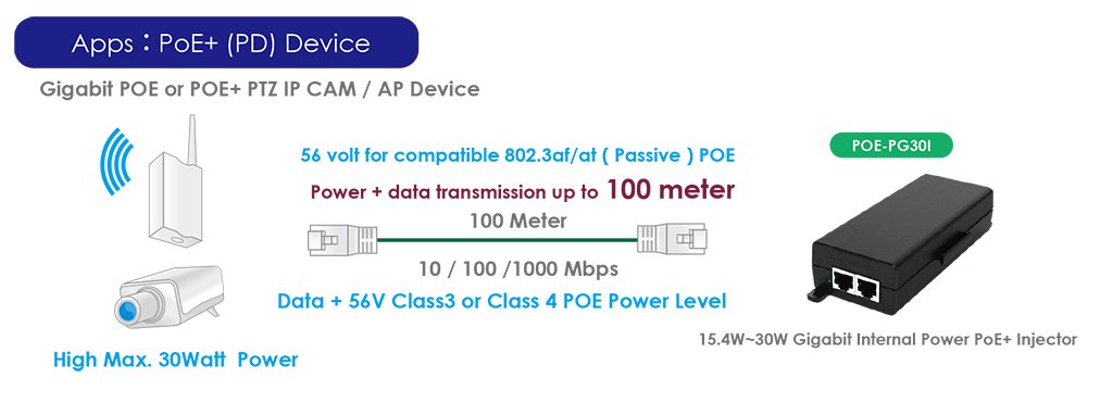 Provides 802.3af/at (Passive) POE power level and PoE max power up to 30Watt Class4 PoE+ output.