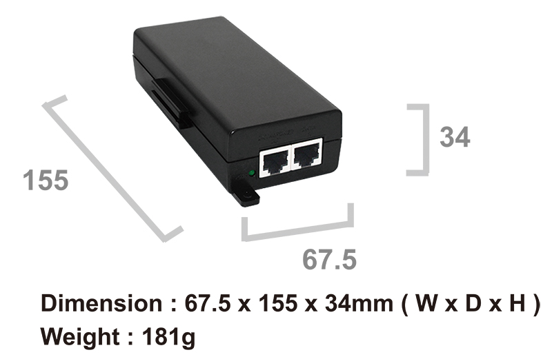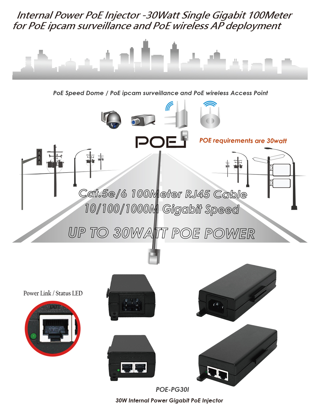 30Watt Internal Power Gigabit POE+ Injector, Shingle-Port POE built-in Power Supply, DC 56V Standard POE Voltage 30W POE power transmission at 100m Distance