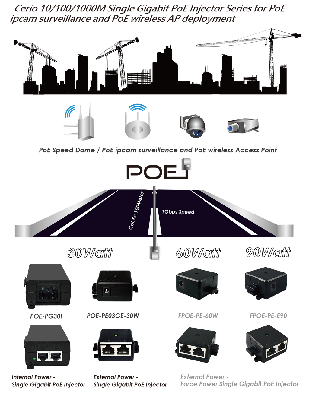 The CERIO POE-PG30I is designed to supply operational power to wireless LAN devices such as PoE access point bridges, routers, and surveillance cameras. With Power over Ethernet devices installed, the system administrator only has to use a single RJ-45 Ethernet cable to carry both power and data to each device. Moreover, it supports PIN 1/2,3/6 and 4/5,7/8 power pin designed, no matter the PD devices is designed Type-A or Type-B all can supply power automatically. The output power will be dependent on the power rating of the power supply that one chooses to use. It brings a great economic benefits to the monitoring surveillance system.